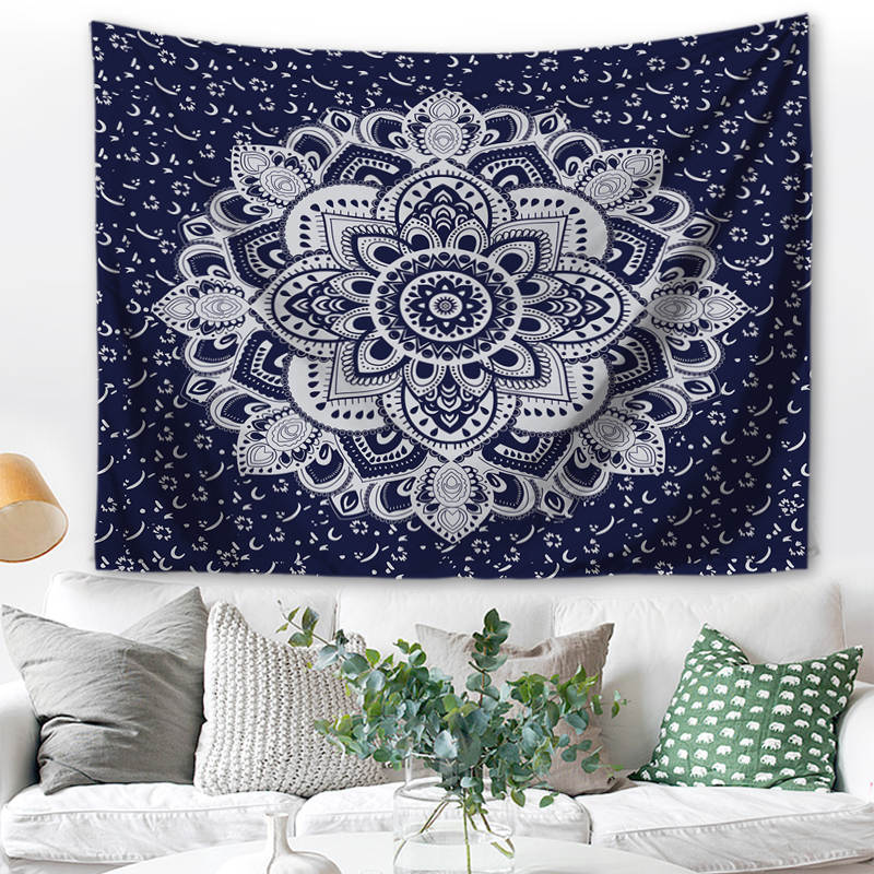 Ästhetischer dunkelblauer Wandbehang mit klassischem, indischem Mandala-Design.
